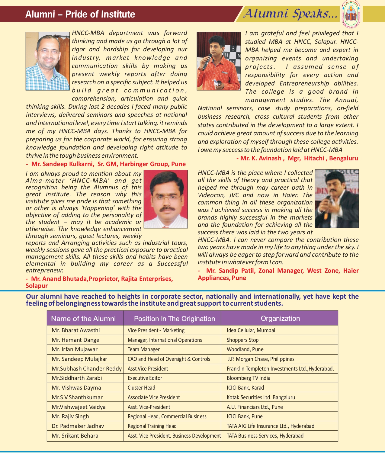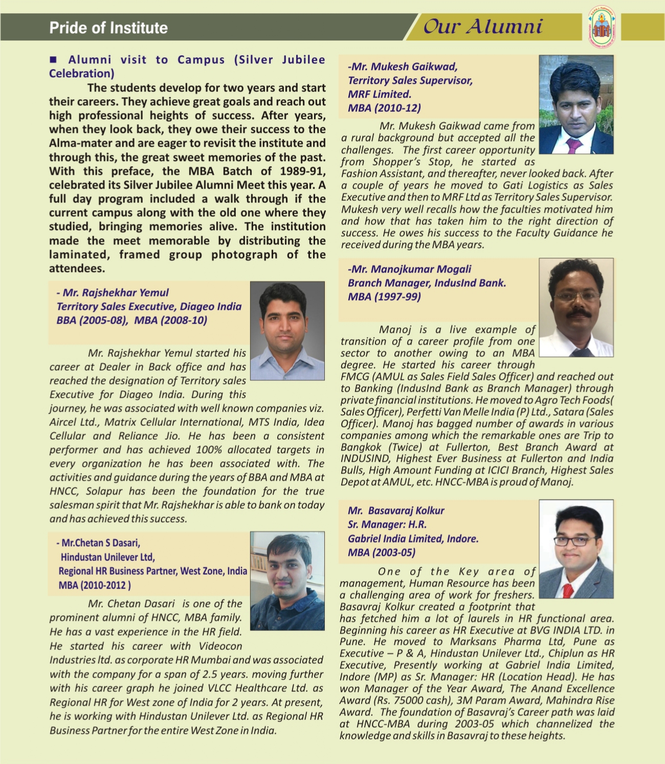 | 21/01/2012 | All Batches | HNCC, MBA Wing, Solapur | 68 | Half Day Registration for the Meet Alumni Introductions Current student Interaction in Panels Entertainment - Curtural Performances by Current Students Dinner. |